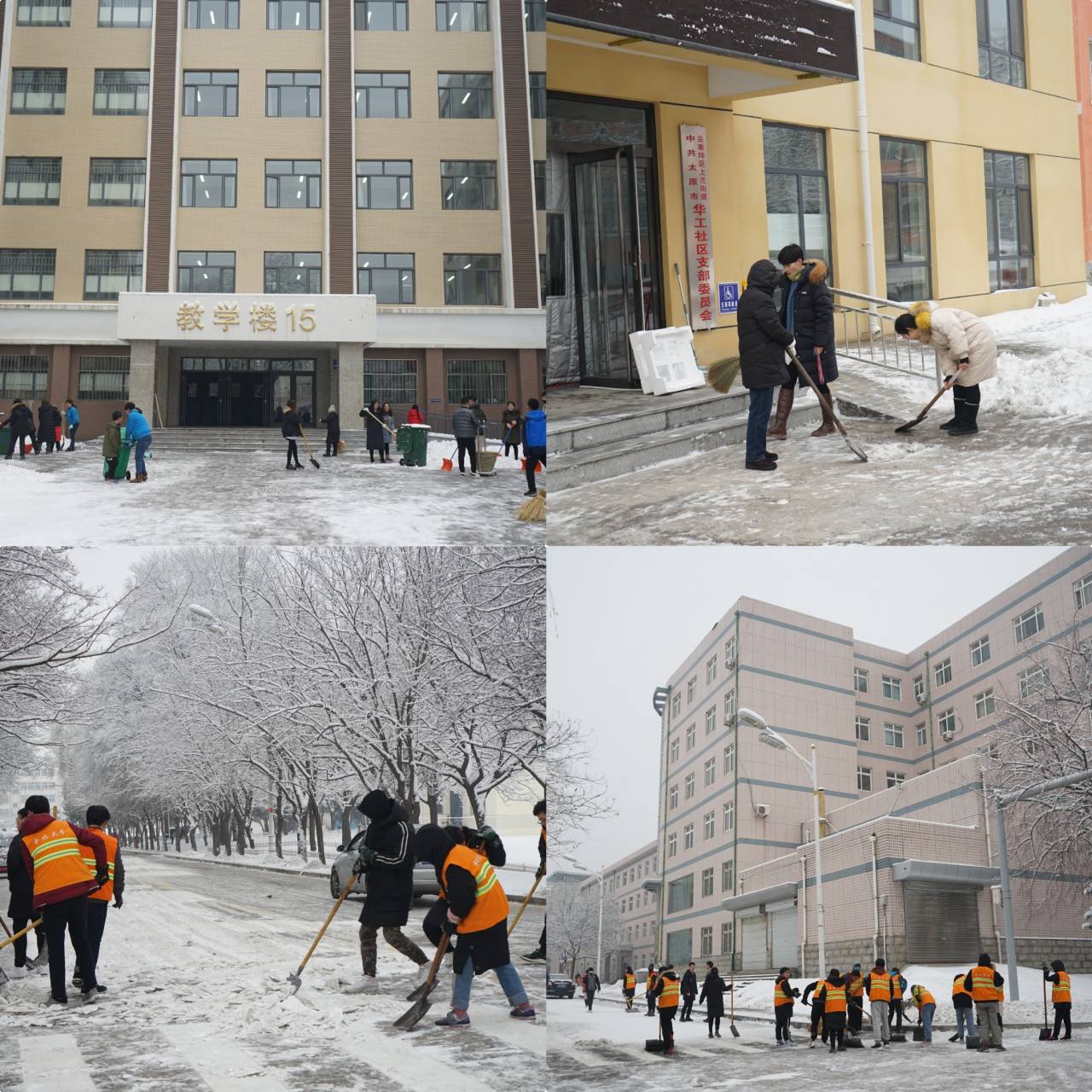 昨日爆红朋友圈的一场大雪,给大家带来美轮美奂的景色和喜悦之情的同时,也对人们安全出行造成了极大影响。按照太原市创城办、太原市文明办关于党员和各级领导干部带头开展清除积雪活动的通知要求,为更好地服务师生出行,1月6日,我校及时组织开展“清扫校园积雪,创设美好环境”主题党日和志愿服务活动,各基层党委、党总支和直属党支部成员参加了活动。