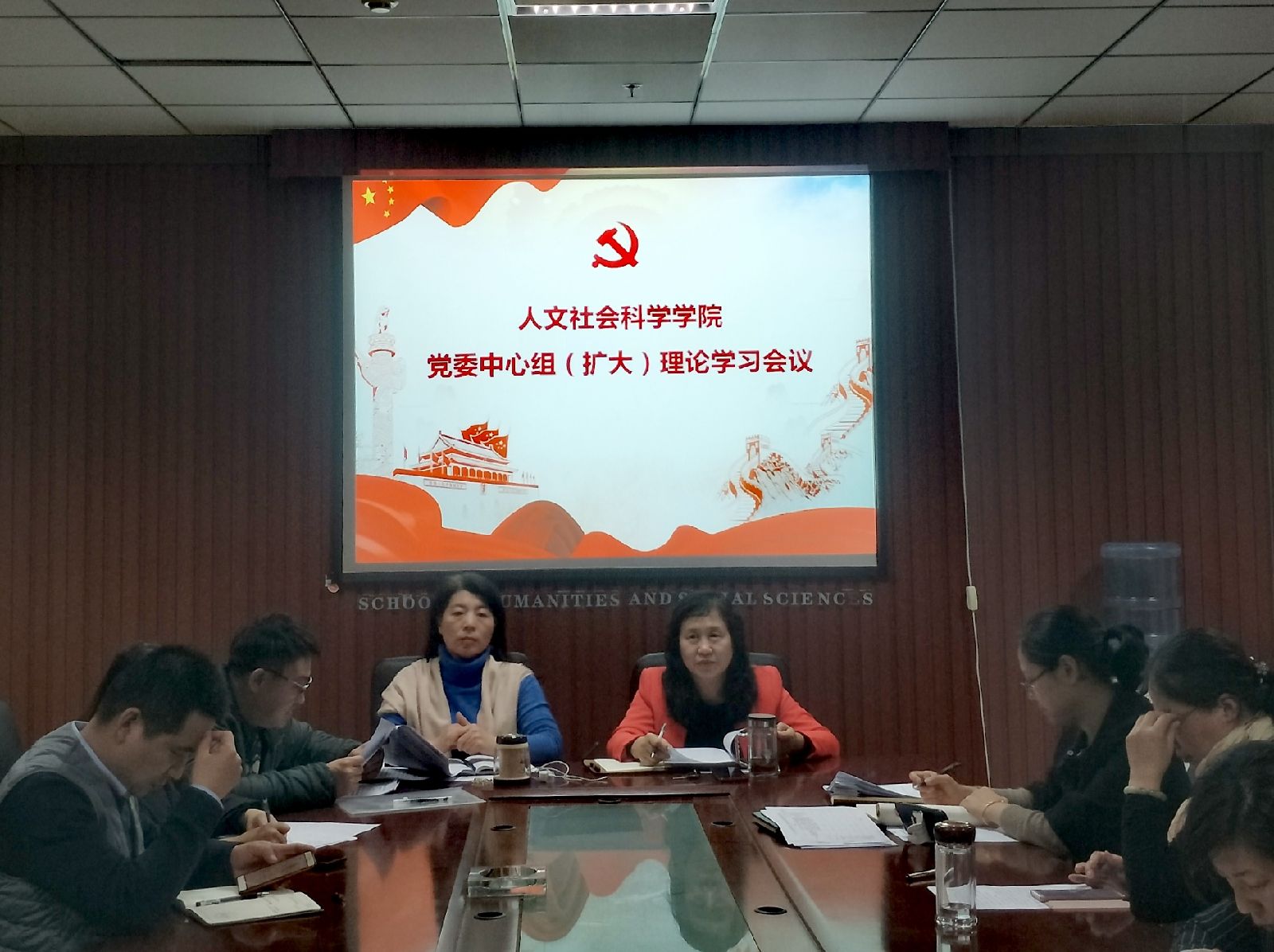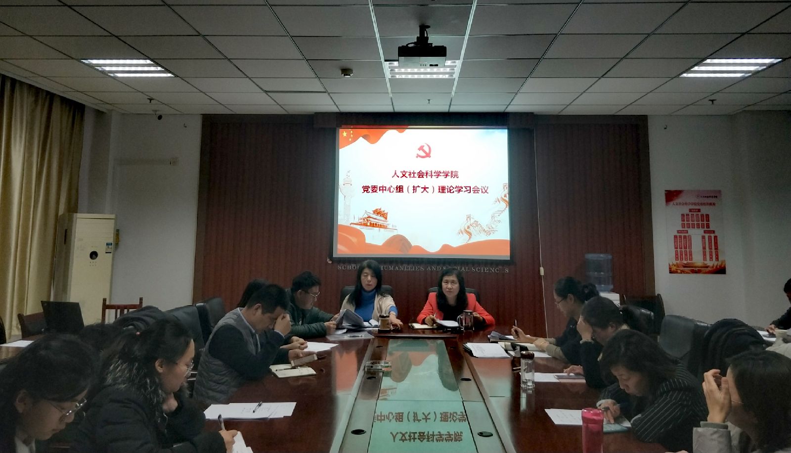 12月25日下午四点,人文社会科学学院在院楼六层会议室组织党委中心组理论学习(扩大)会议,专题学习习近平总书记“三篇关辉文献”。院党委书记雷丽蓉主持学习。全体院领导、院党委委员、各党支部书记、支委参加了学习活动。
