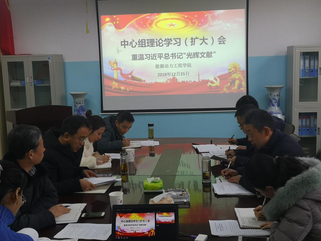 为进一步高举习近平新时代中国特色社会主义思想伟大旗帜,把思想和行动统一到习近平总书记重要讲话精神上来,2019年12月25日,能源动力工程学院于诚学楼201会议室召开中心组理论学习(扩大)会议,重温习总书记“光辉文献”。学院全体领导班子成员及党支部书记参加本次学习会,会议由院党委书记李运芝主持。