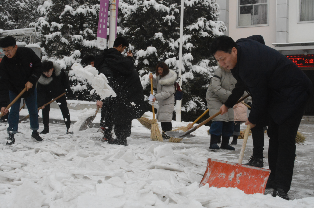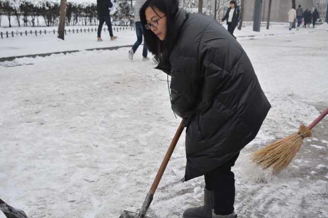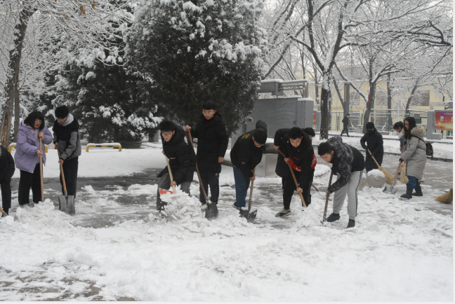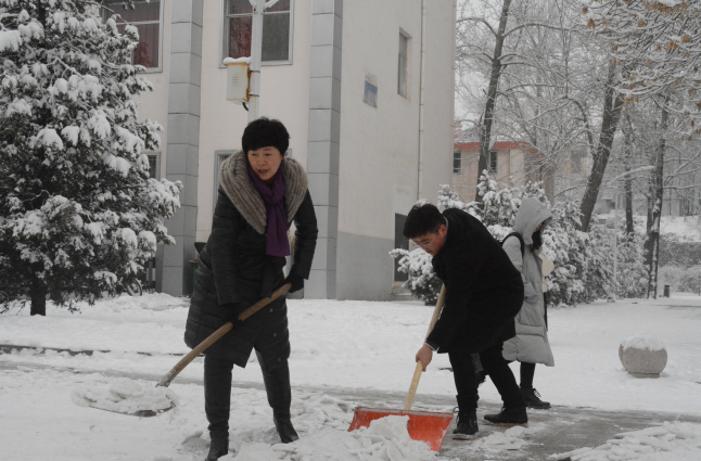 大家共同扫雪的场面,为冬日寒冷的天气增添了一抹温情,也用实际行动号召全院师生积极行动,弘扬志愿精神,主动参与扫雪铲冰,全体动员,全民动手,保障学校正常的学习生活秩序。俗话说“瑞雪兆丰年”,皑皑白雪也预示着2020年艺术学院党委的工作也必将蒸蒸日上。