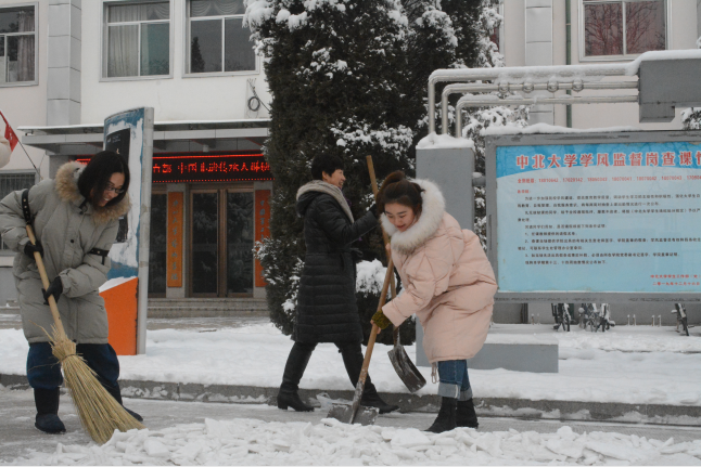 2020年的第一场雪,校园各处银装素裹,给广大中北师生带来惊喜和兴奋,但同时也给大家的出行带来了诸多不便。为确保道路畅通、出行安全,1月6日上午09:30,艺术学院党委开展“清扫校园积雪,创设美好环境”主题党日活动,学院领导班子成员及广大师生党员、积极分子积极响应号召纷纷参与到铲雪除冰活动中来。