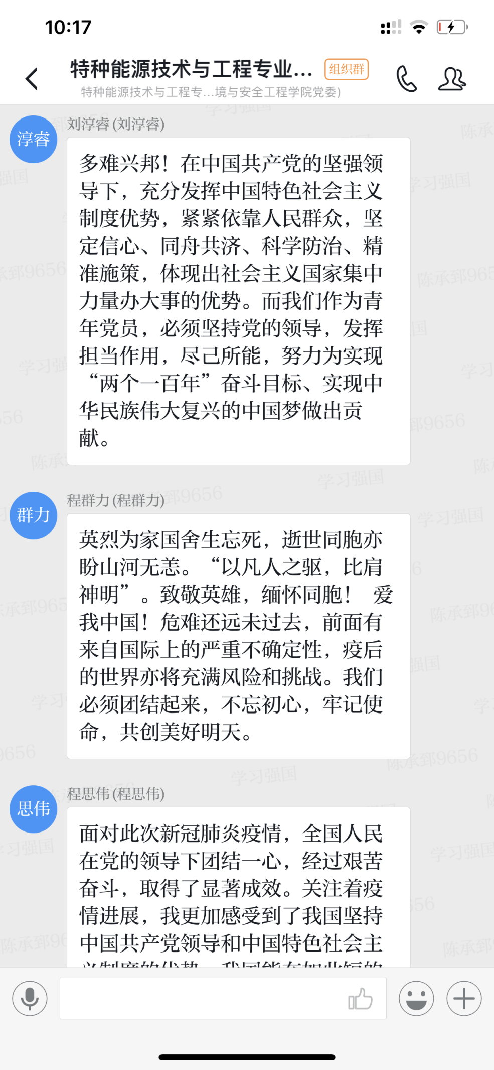 安全工程专业学生党支部、环境工程研究生党支部、环境专业学生党支部、特种能源技术与工程学生党支部等党支部通过学习强国、微信群、腾讯APP等多样形式,组织党员在线学习习近平总书记关于疫情防控工作的重要指示精神和各级决策部署,传达中央精神、政府通报、防控知识,做到“学习多样化,效果不打折”。