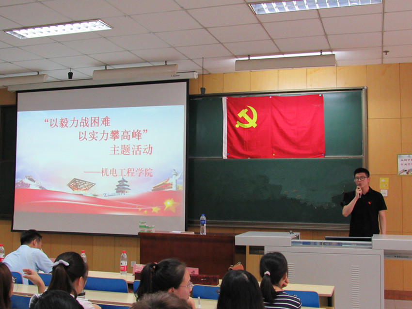 2018年6月25日下午4点,机电工程学院在11109H教室举办了“以毅力战困难,以实力攀高峰”的主题活动,由毕业生党员、2018年校长奖章获得者刘博进行宣讲。出席本次活动的有机电工程学院党委副书记刘光,学生科科长张丽花老师,学生科于晶、段志微老师、赵振霞老师、贺婧老师以及全体党员。