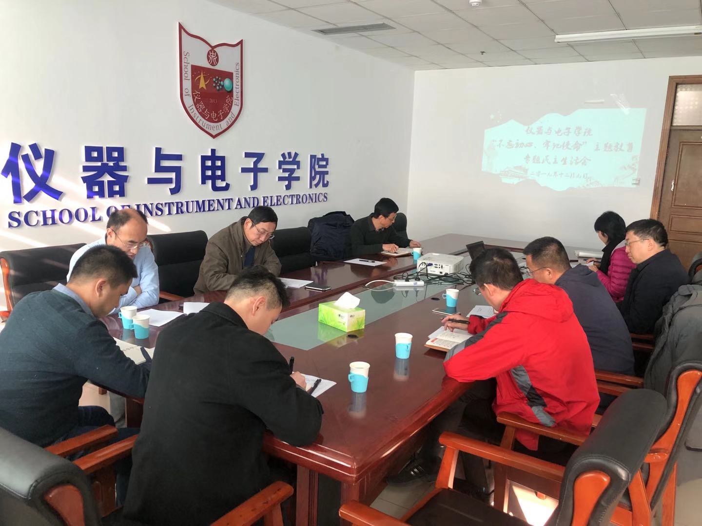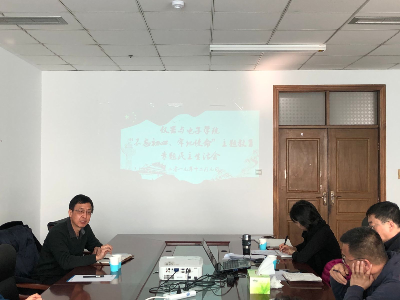 根据校党委《关于召开“不忘初心、牢记使命”主题教育专题民主生活会的通知》的要求,2019年12月9日上午,仪器与电子学院在主楼1207会议室召开了领导班子主题教育专题民主生活会。校纪委纪委委员、研究生院胡双启院长应邀出席并进行督导,学院全体领导班子成员参加会议。会议由学院党委书记郝晓剑主持。