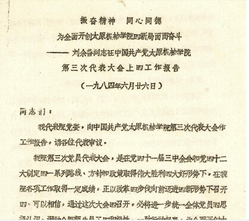 1984年6月23日,中国共产党太原机械学院第三次党员代表大会召开。刘余善同志代表学院党委作了题为《振奋精神,同心同德,为全面开创太原机械学院新局面而奋斗》的工作报告。报告总结了复校6年来学院各方面工作取得的成绩,提出了学院第七个五年计划期间的奋斗目标,即在“调整、改革、整顿、提高”的方针指导下,经过艰苦努力,把太机基本办成理工结合、以工为主、军民结合、以军为主的多科性常规兵器国防院校,并力争接近和达到国防院校中重点大学的教学水平、学术水平和管理水平,为兵器工业的生产和科研培养更多的合格人才。会议选举产生了中共太原机械学院第三届委员会,委员有刘余善、陈景堂、何铭生、陆庆武、何源海、郭清俭、欧阳宣。经过党委第一次会议选举、中共山西省委批准,刘余善任党委书记,陈景堂、何铭生任党委副书记。会议还选出了中共太原机械学院纪律检查委员会,郭清俭任纪委书记。